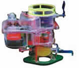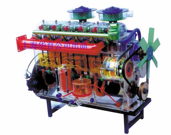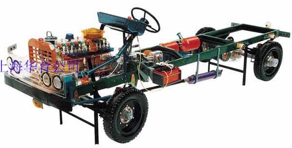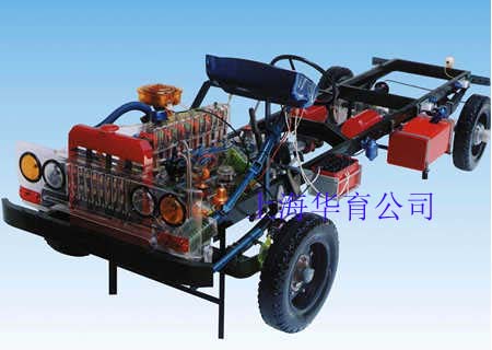 本品選用透明有機(jī)玻璃制作,內(nèi)中部件均以硬質(zhì)塑料料加工,用 螺絲固定在金屬高溫烘漆而成的車架上。各總成部分都以壓模成形加 工,代替過去膠粘合的方法,使產(chǎn)品在強(qiáng)度上有很大提高。發(fā)動機(jī)總成用電機(jī)驅(qū)動,在油門處設(shè)有調(diào)速裝置,能演示發(fā)動機(jī)轉(zhuǎn)速高低。離合器分離明顯,操縱靈活,離合器外殼整體壓模而成,變速箱和各檔齒輪用各種顏色表示,換檔靈活,手制動美觀。后橋外形壓模而成,內(nèi)中主減速、差速轉(zhuǎn)動自如,輪轂剎蹄壓模成型,剎蹄可調(diào)節(jié),前橋輪鼓可調(diào)整,轉(zhuǎn)向裝置以及電瓶、油箱、水箱,制動管路分布清楚一目了然。電路采用對插件前后分布,燈架、風(fēng)窗、儀表板、后燈架用透明有機(jī)玻璃壓模成整體美觀逼真。